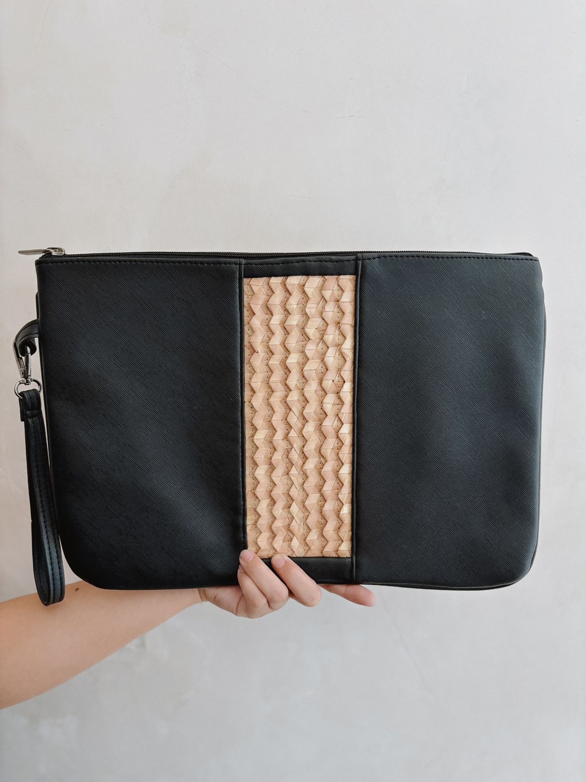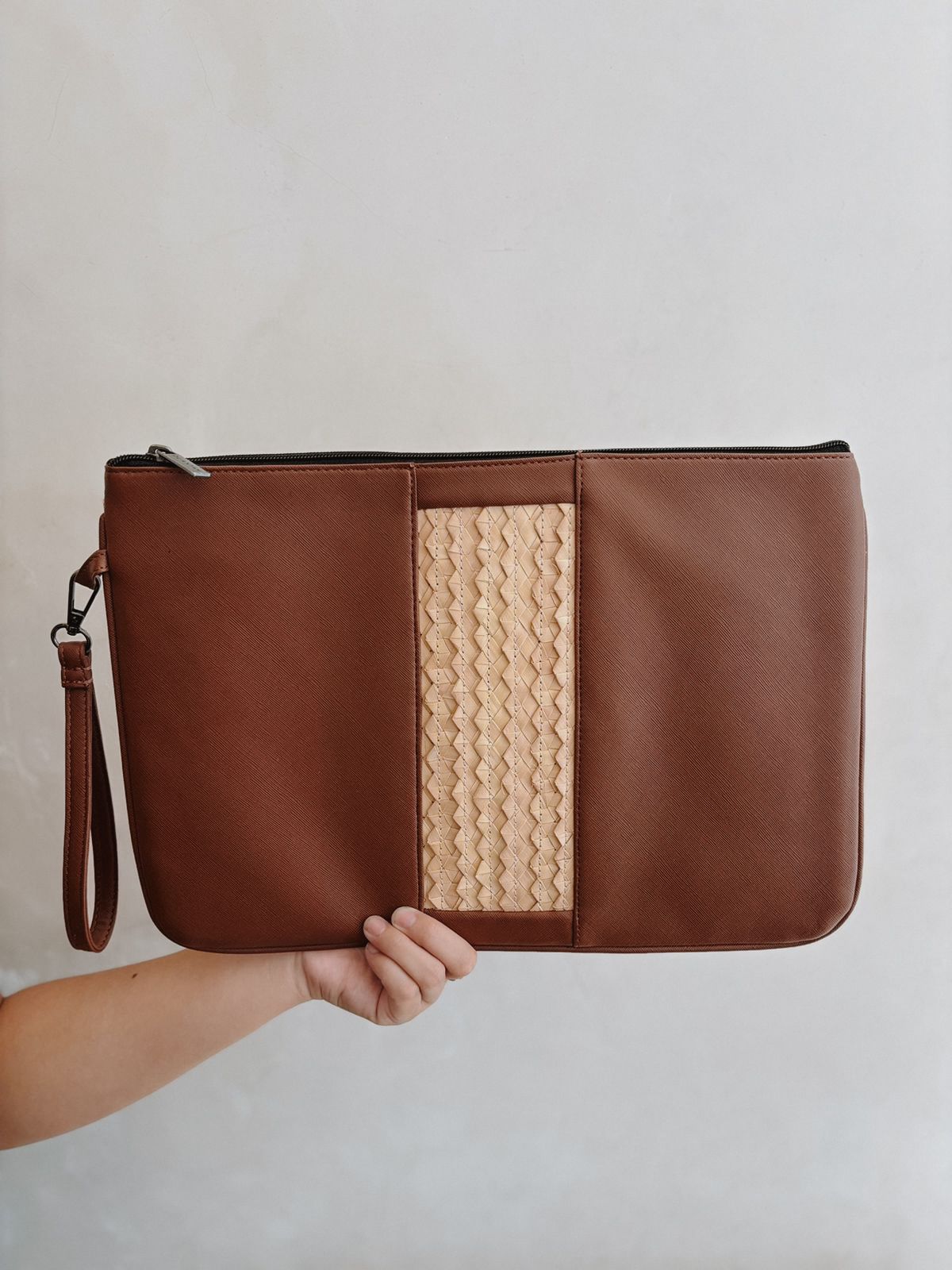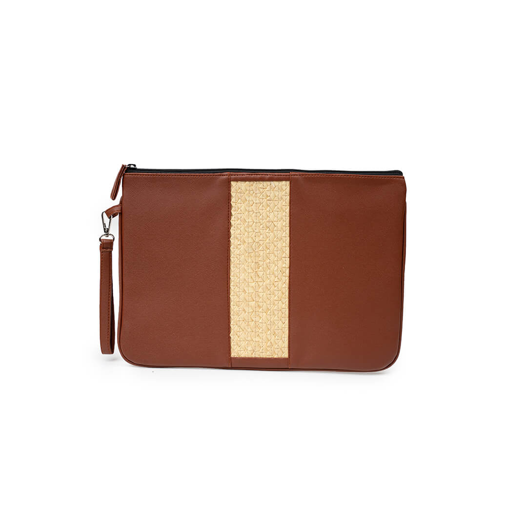 Introducing the Cove Rattan Laptop Pouch - the sustainable and handmade solution to your organizational needs! Keep your laptop safe and organized in style with this unique pouch made of quality rattan and vegan leather. Say goodbye to clutter and hello to efficiency with Cove!