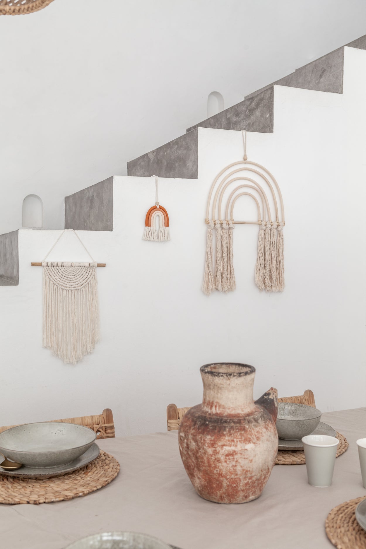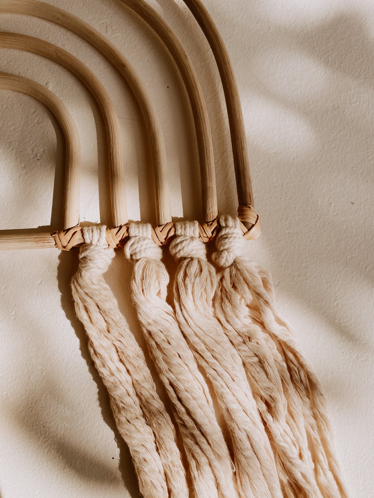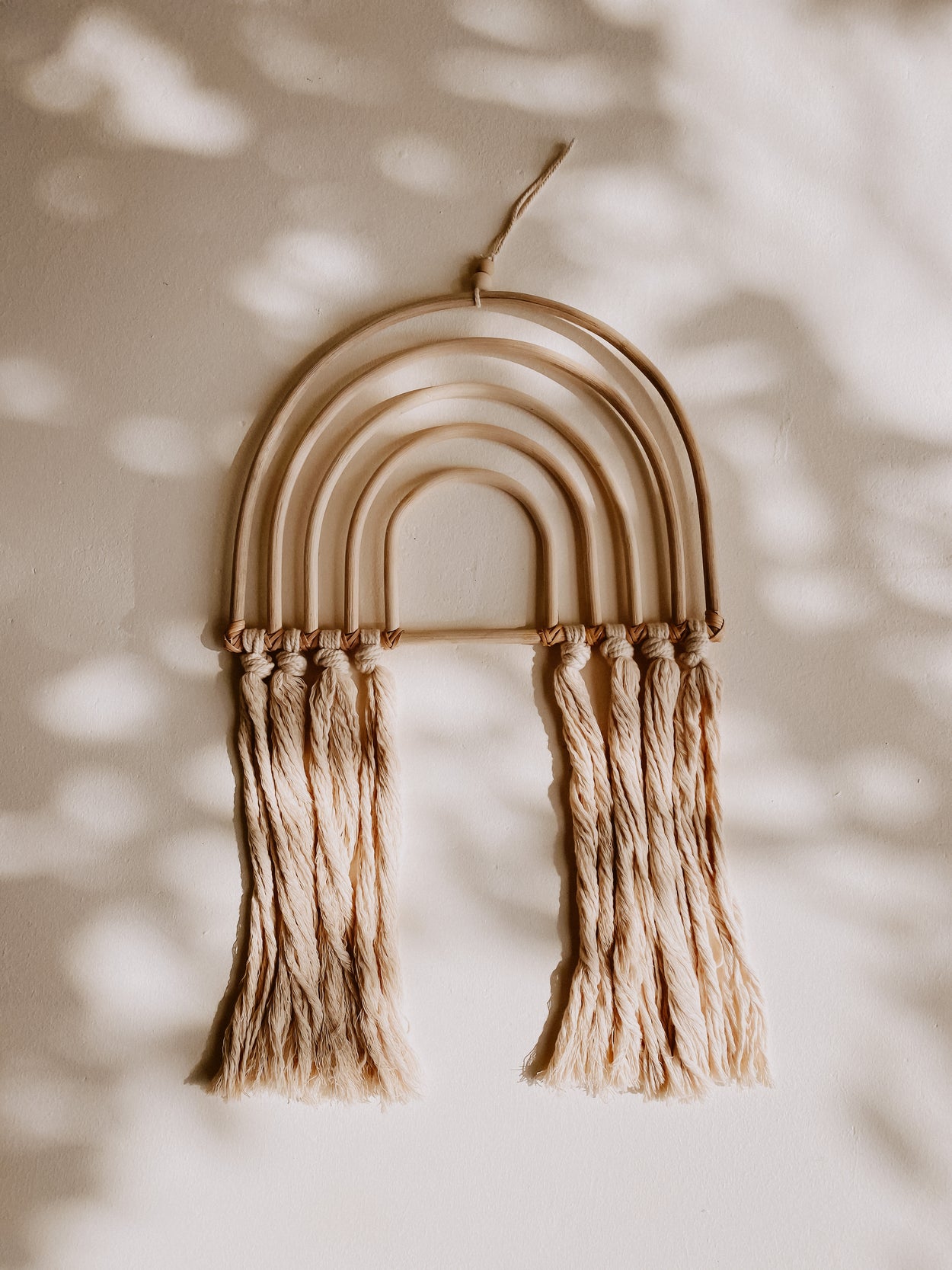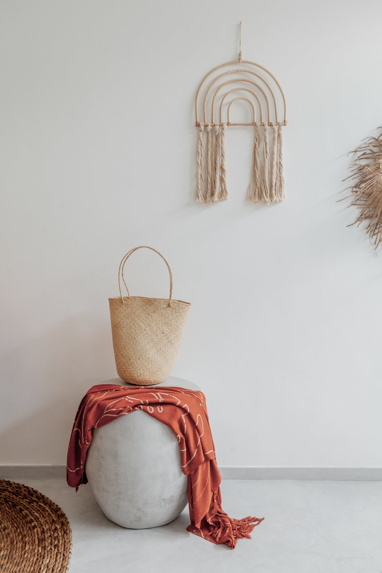This exclusively designed piece of wall art is equal parts warm and soft making sure to brighten up any space. Features include raw rattan, wrapped corners and 100% organic cotton tassels making it both elegant and playful. And, as always, this rainbow is made by loving hands in Bali, Indonesia.