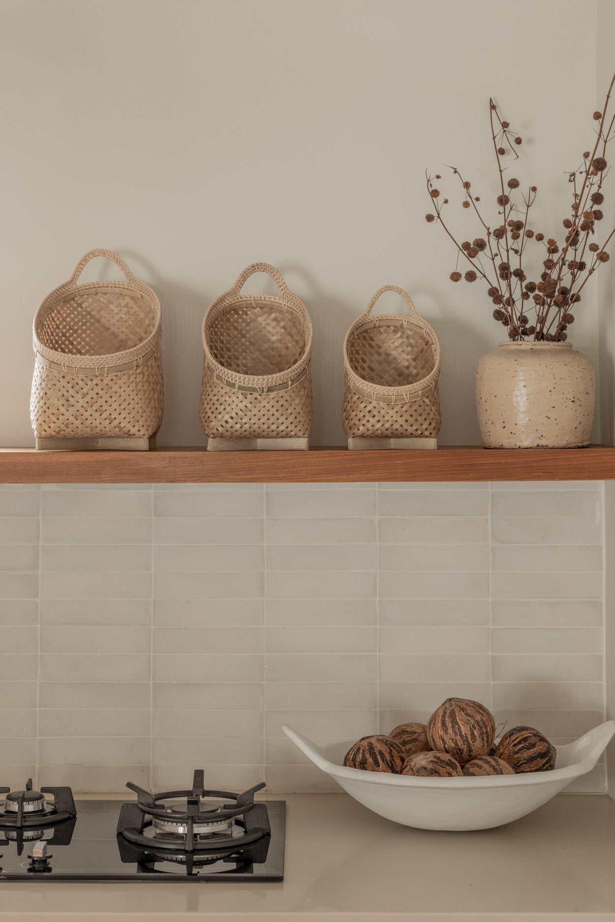 Our standing set of storage baskets is the perfect solution for storing small items. Lightweight, woven from natural materials, and with a handle for optional hanging. Handmade in Bali, Indonesia in a traditional fashion.