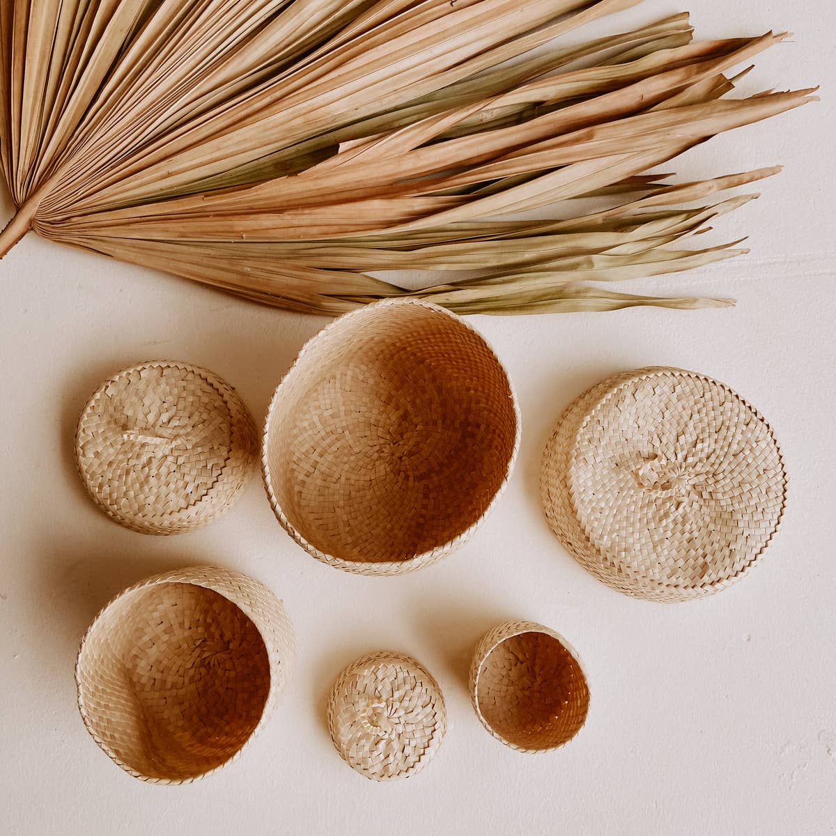 Our blonde set of storage baskets is the perfect solution for storing small items. Lightweight, woven from natural materials, and light blonde in color. Handmade in Bali, Indonesia in a traditional fashion.