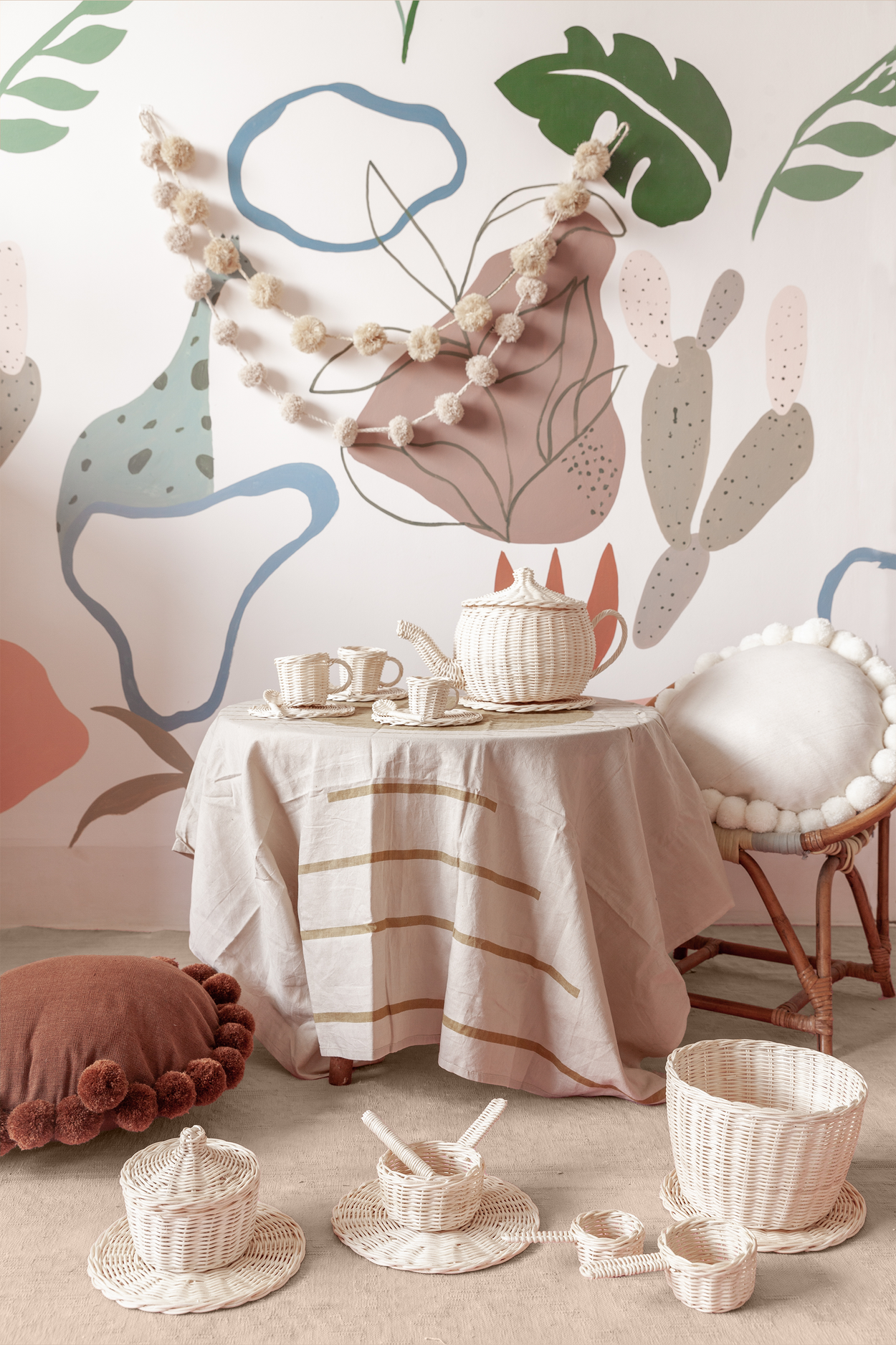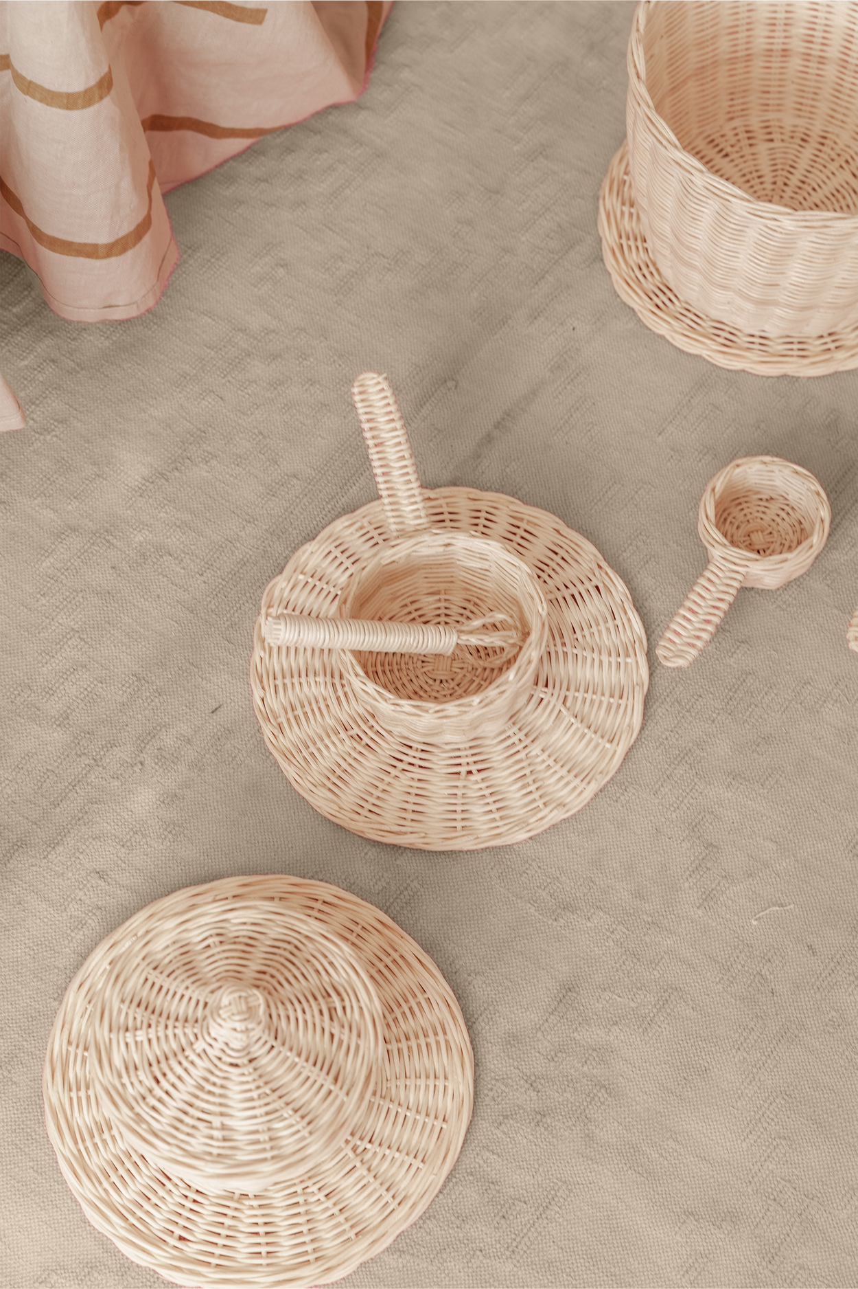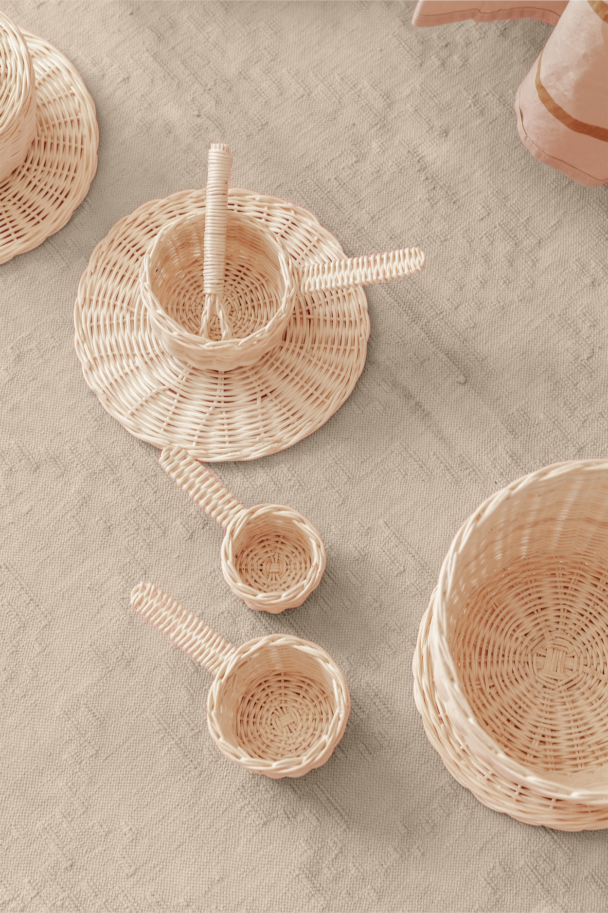 Designed with attention to detail, handcrafted with natural materials. This timeless kids rattan baking set comes complete with a handwoven mixing bowl, measuring cups, canister with lid and the sweetest whisk and stirring spoon set.