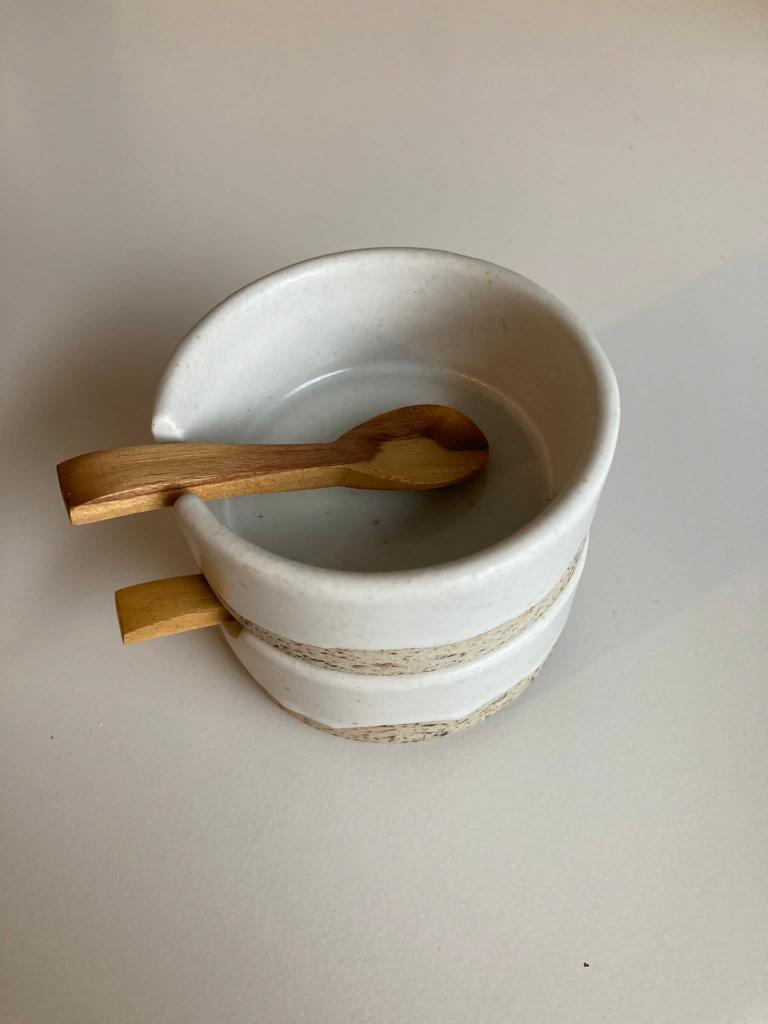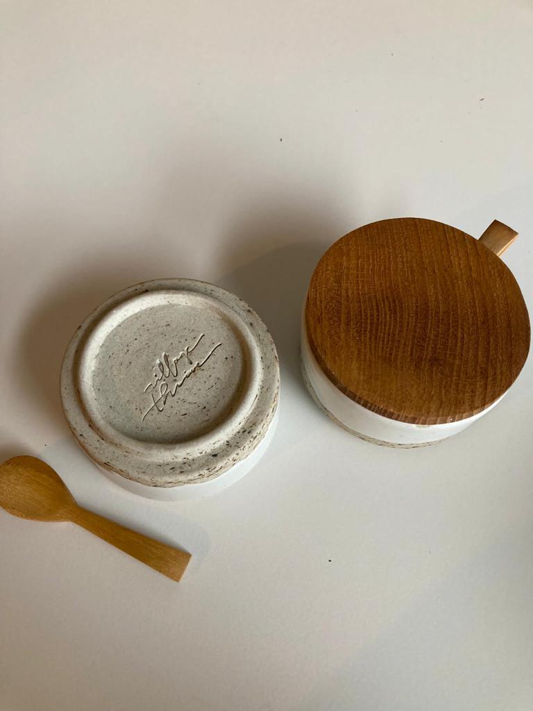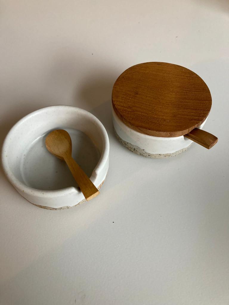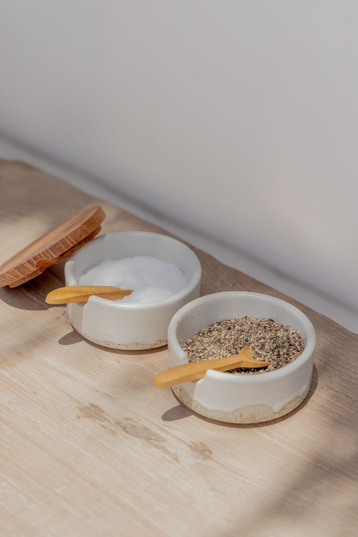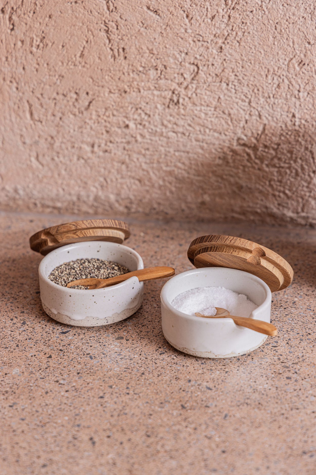 Intentionally designed to show the handcrafted nature of each piece, the Wabi Collection is comprised of ceramics with character as they are crafted, glazed, and fired by a women run artisan collective. Elevate your tablescape with this adorable and functional salt and pepper holder, complete with a wooden lid and two wooden spoons.