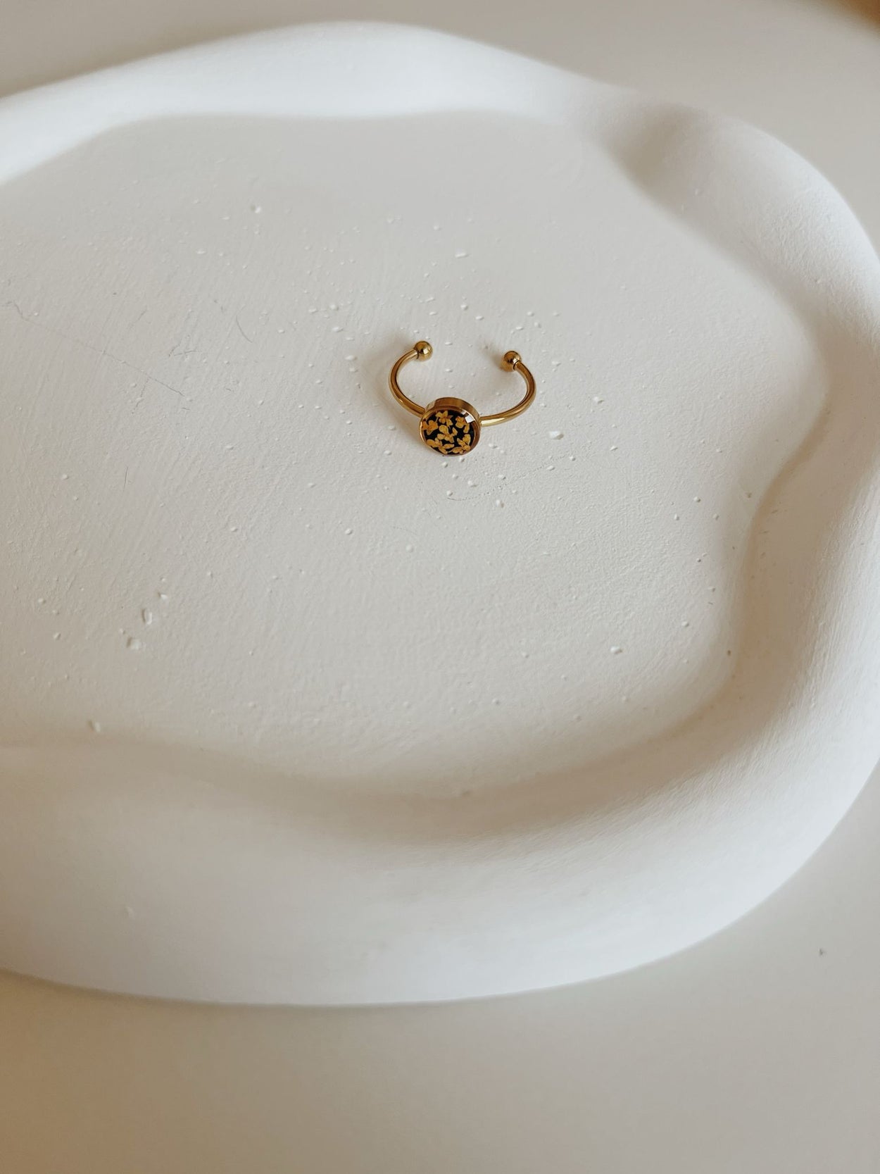 A delicate touch of nature, designed to be worn every day. This handcrafted gold ring features real flowers carefully preserved in resin, capturing their beauty in a timeless piece. Simple yet unique, it’s a reminder of nature’s quiet elegance—perfect for stacking or wearing on its own.