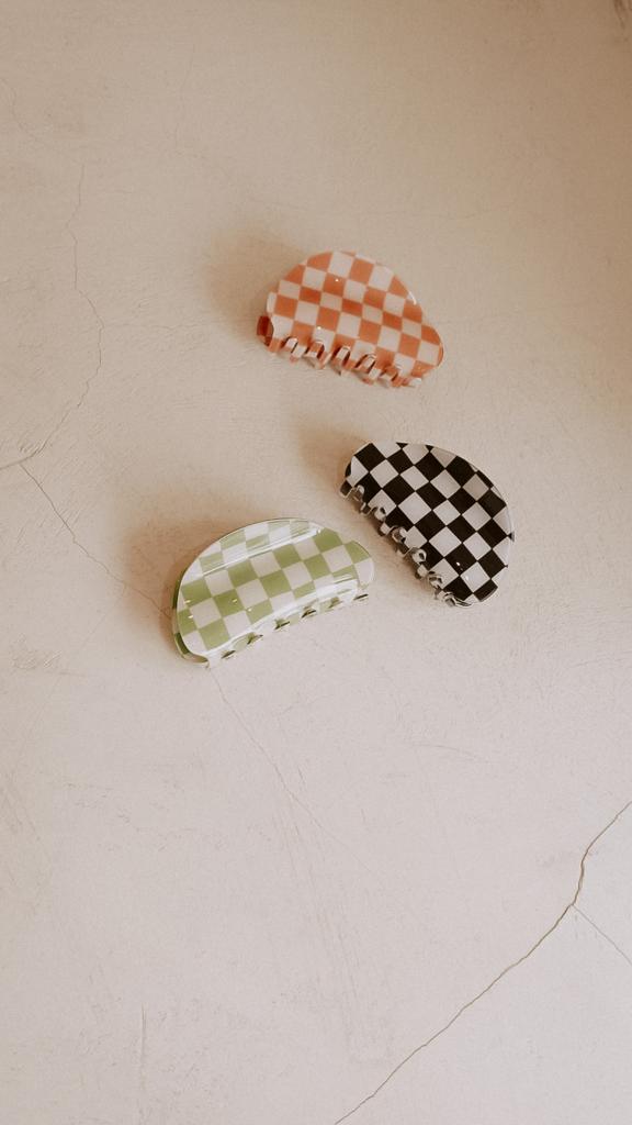 Add a unique flair to your hairstyle with our Checkered Hair Clips. Made from recycled acetate, these hair clips feature a fun and unique checkered design in three colorways. An eye-catching accessory that makes a statement.