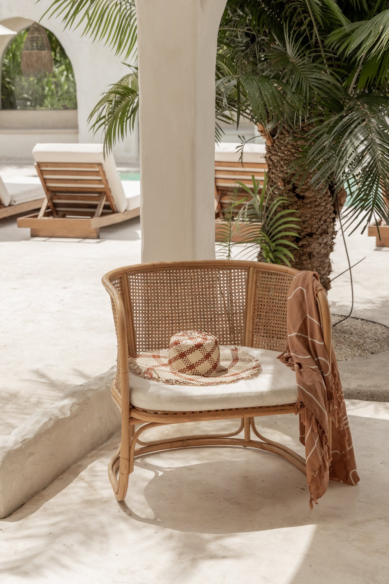 Keep the sun off your face and out of your eyes with our hand woven sun hat featuring an elegant plaid pattern and playful, frayed edge. Each hat is artisan crafted from natural materials in Bali, Indonesia.