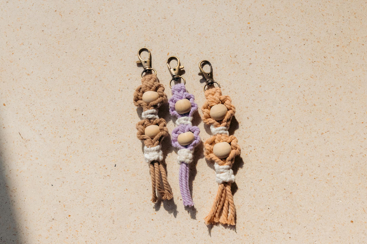 The Flora Macrame Keychain is made using organic cotton and wood bead accents. Featuring a flower pattern in three color options. Sold individually or as a set of 3. Each keychain is handmade and great for gifting.