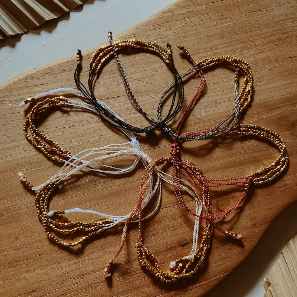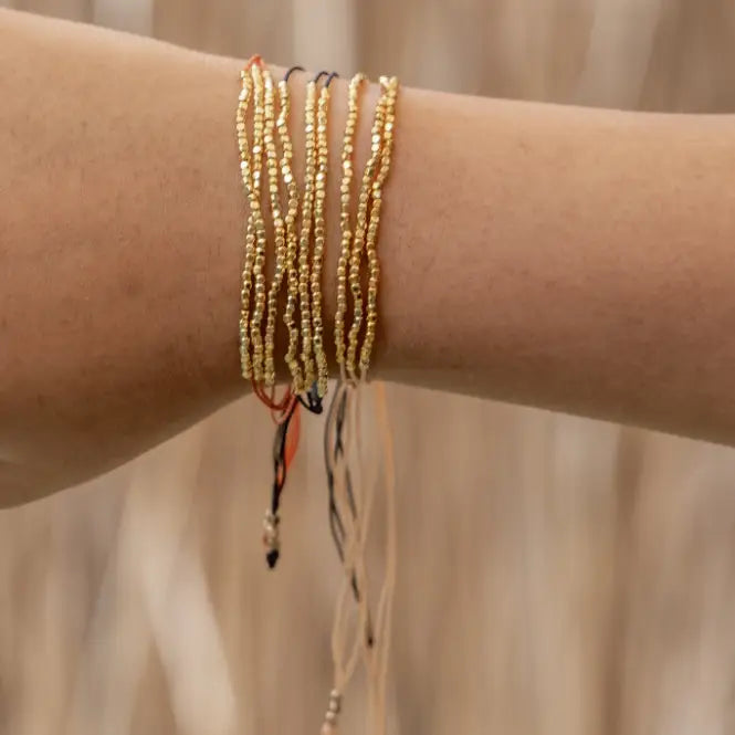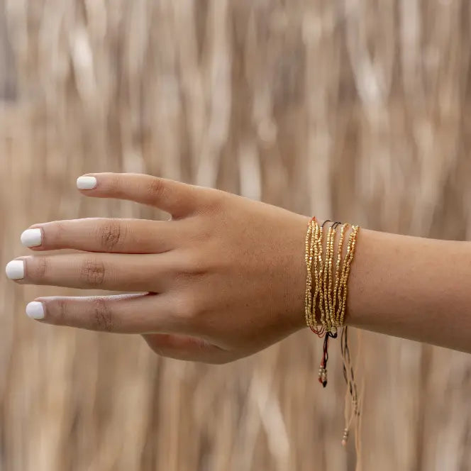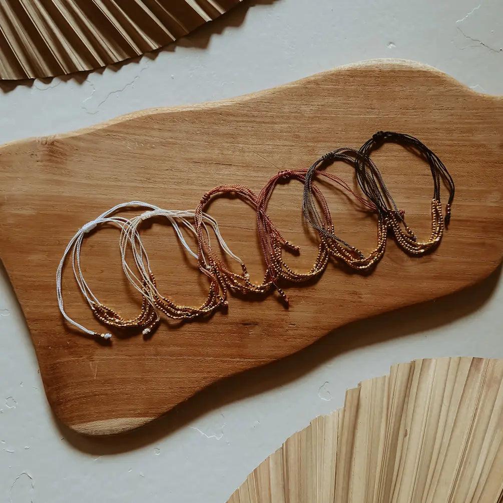 Our Terra Layered Bracelets feature three strands of dainty golden beads attached to delicately woven thread. Simple and sophisticated. Lightweight and adjustable for all sizes. Available in Black, Grey, White, Terracotta, Desert Tan, and Stucco.
