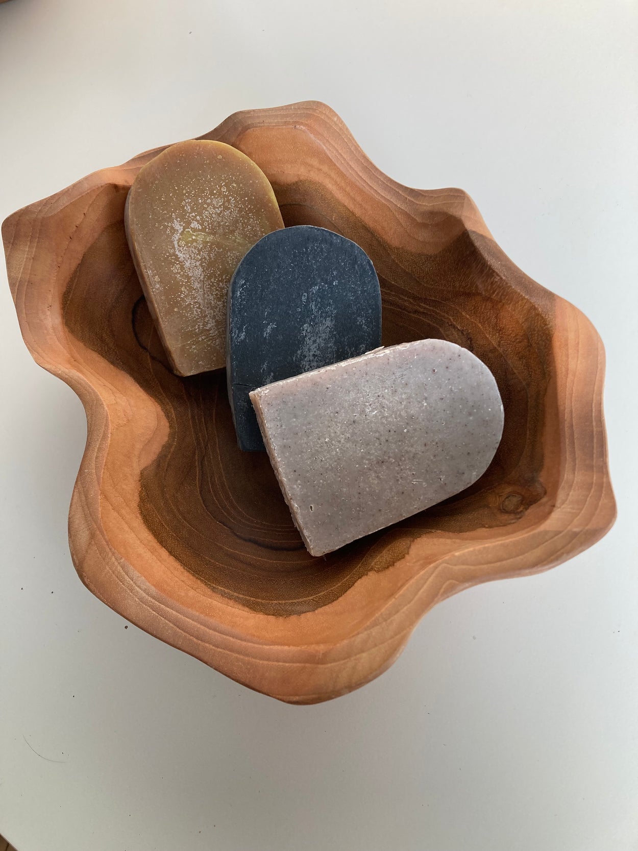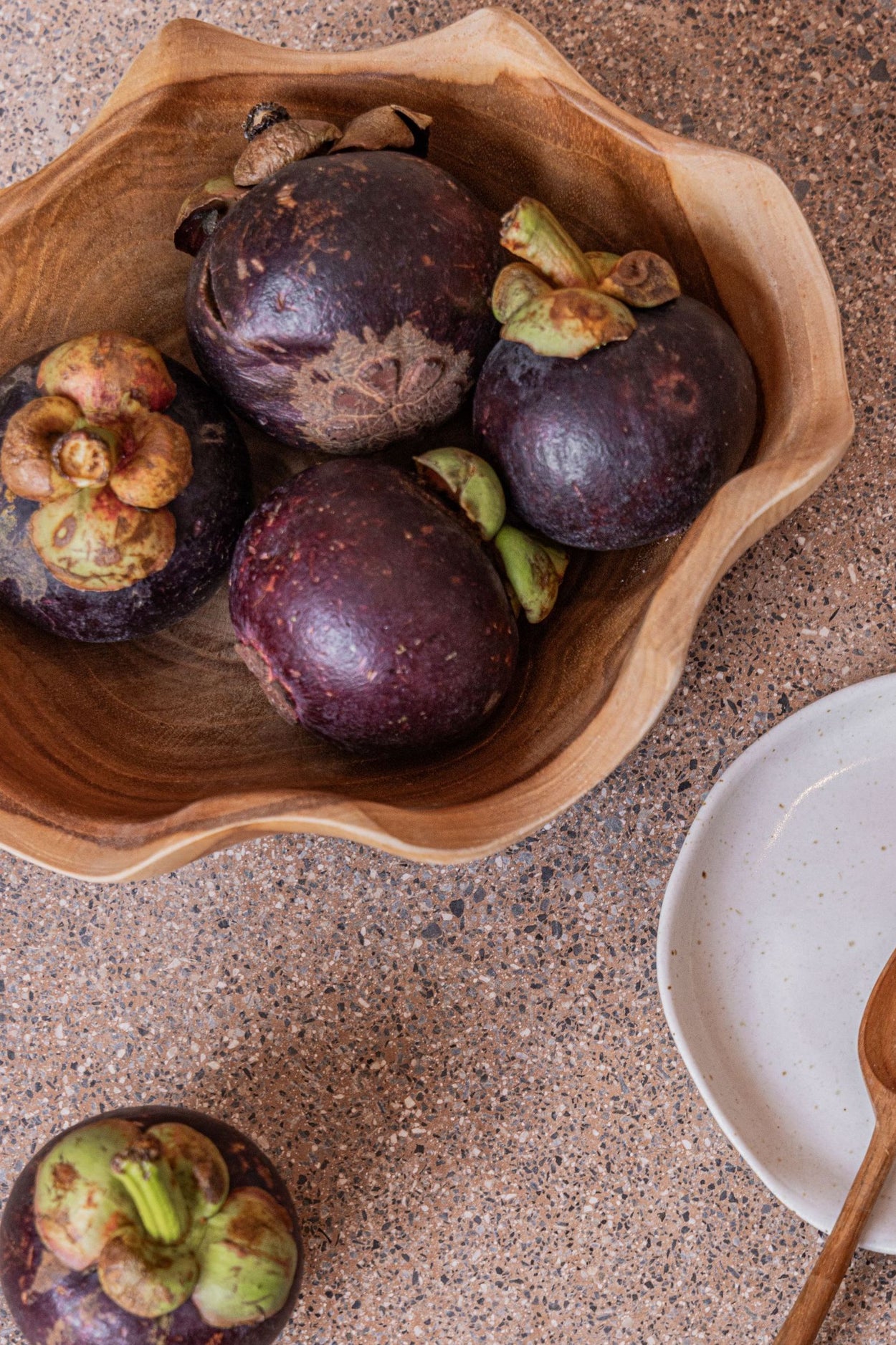 Hand carved from teak. No two are alike and boast a marbling of rich browns, golden hues, and tans.
