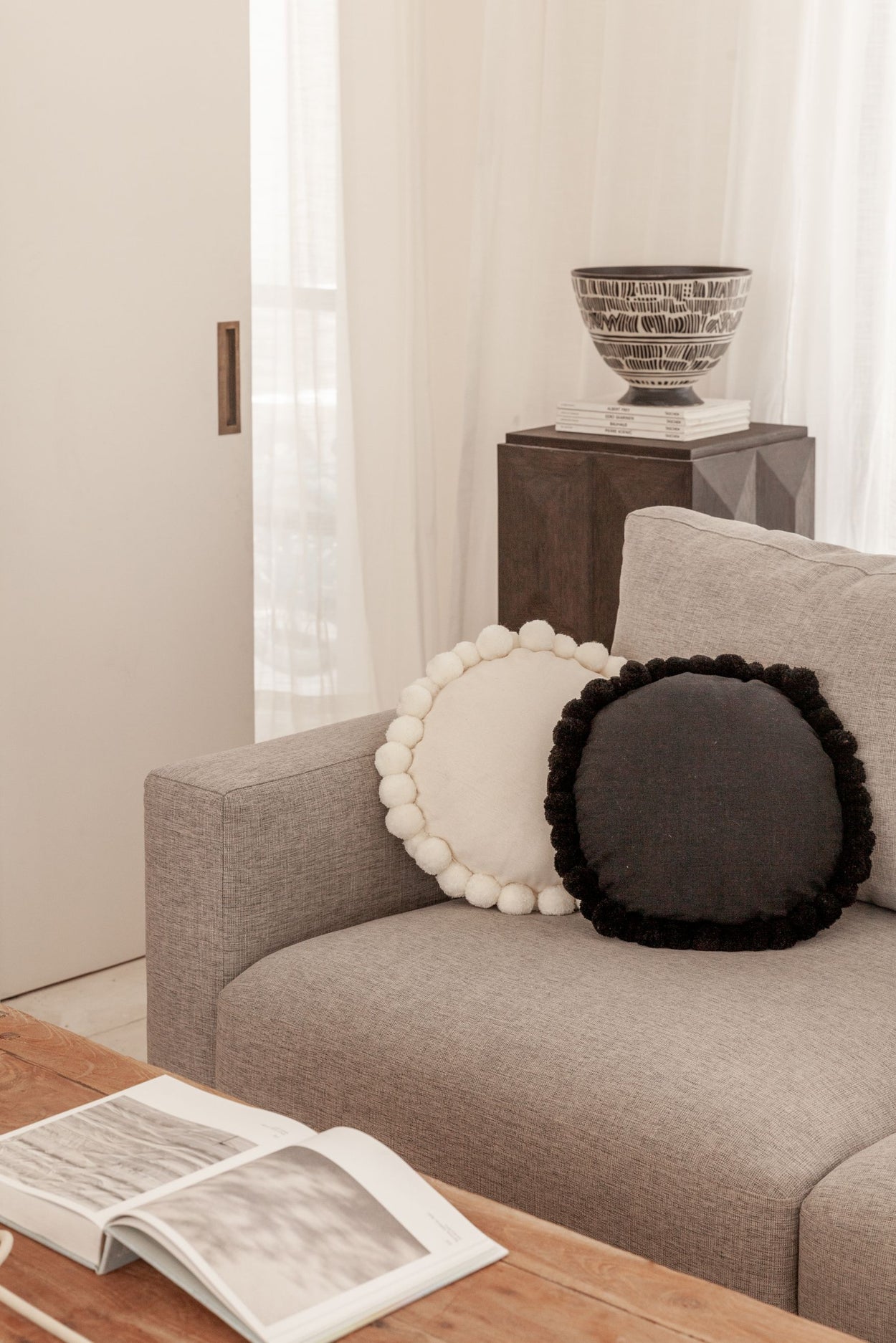 Handcrafted from organic cotton, these round, pom pom fringed pillows are sure to make a beautiful statement wherever they may land in your home. Style them together or separately.